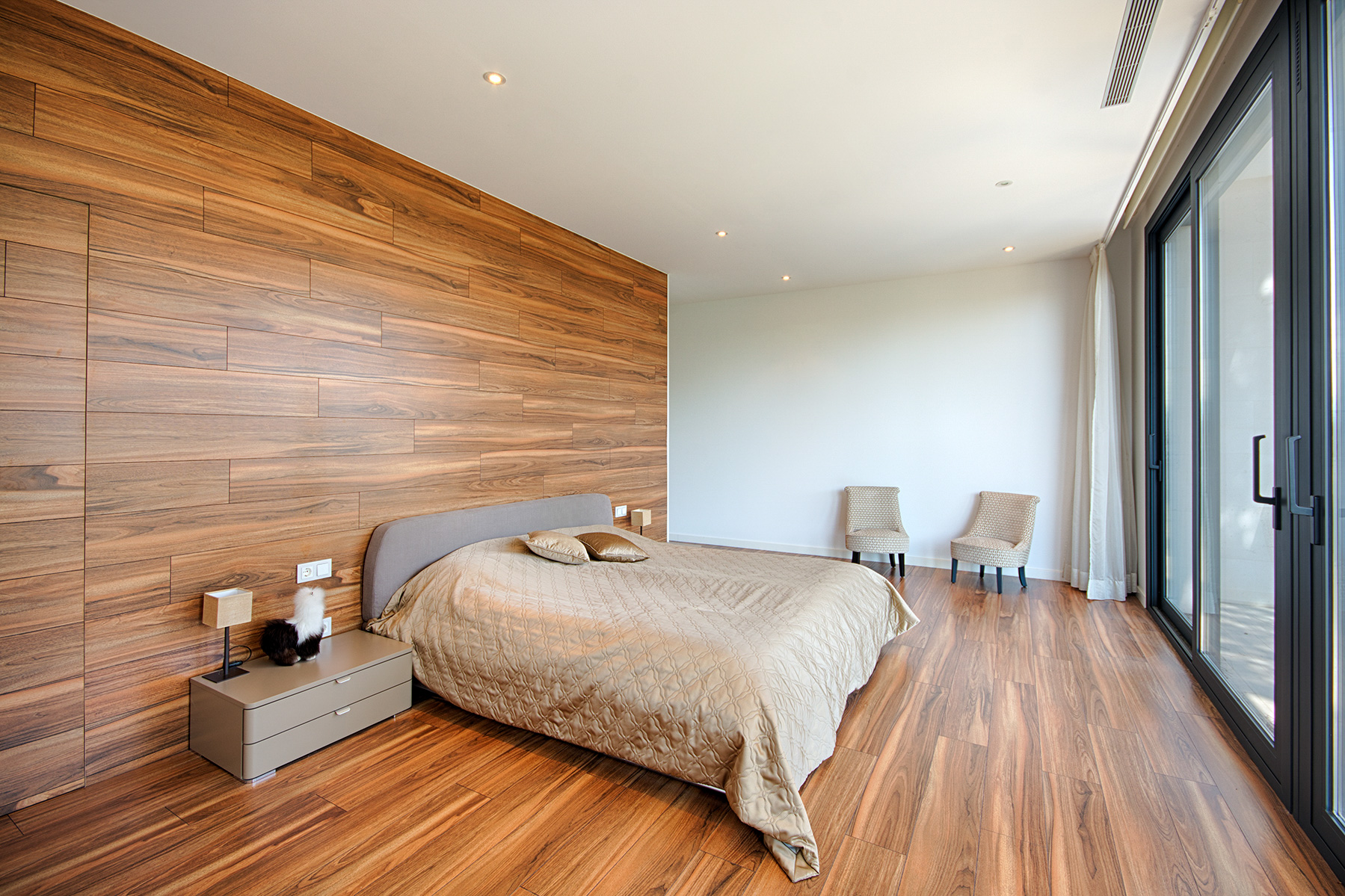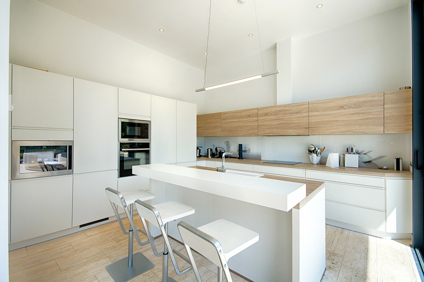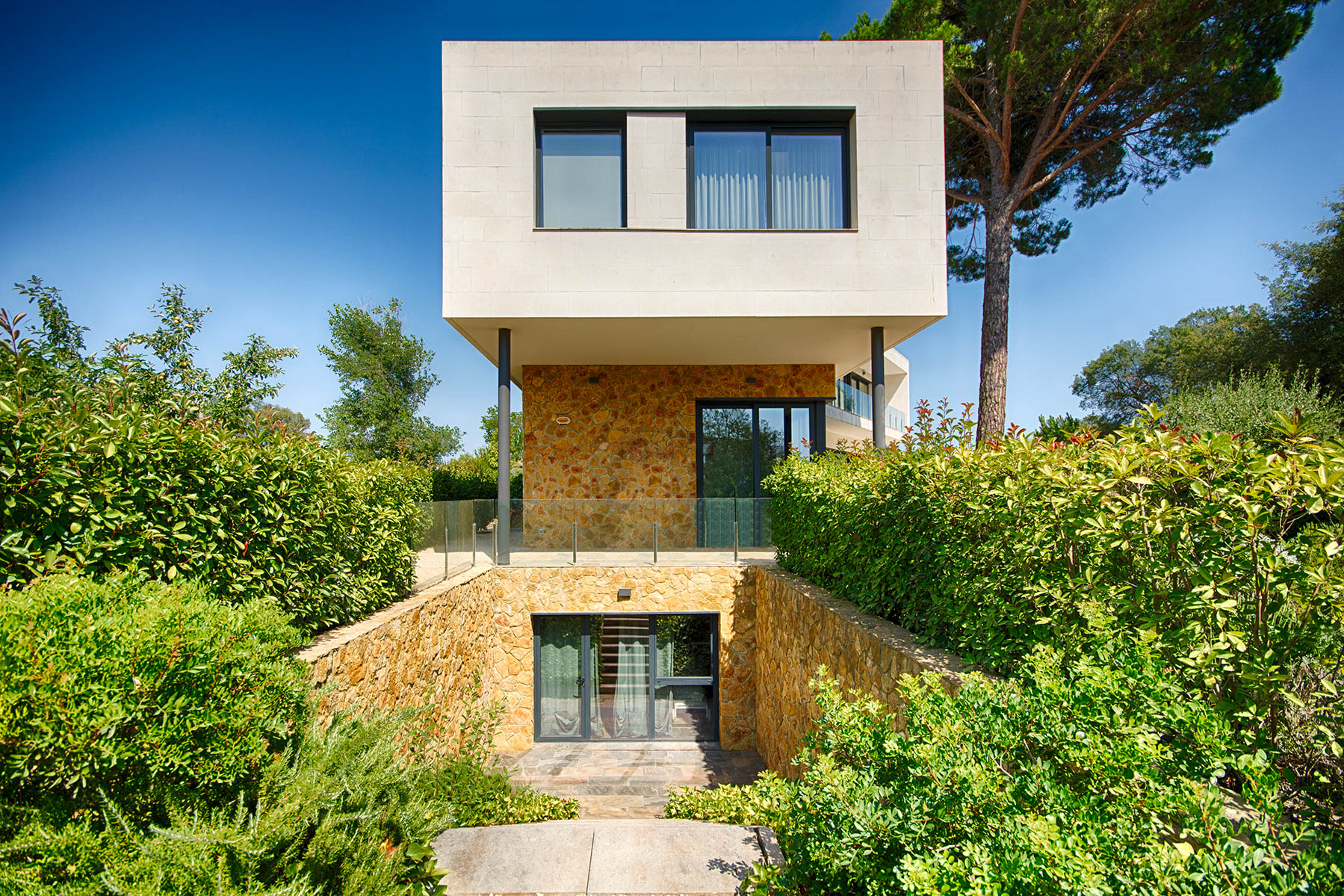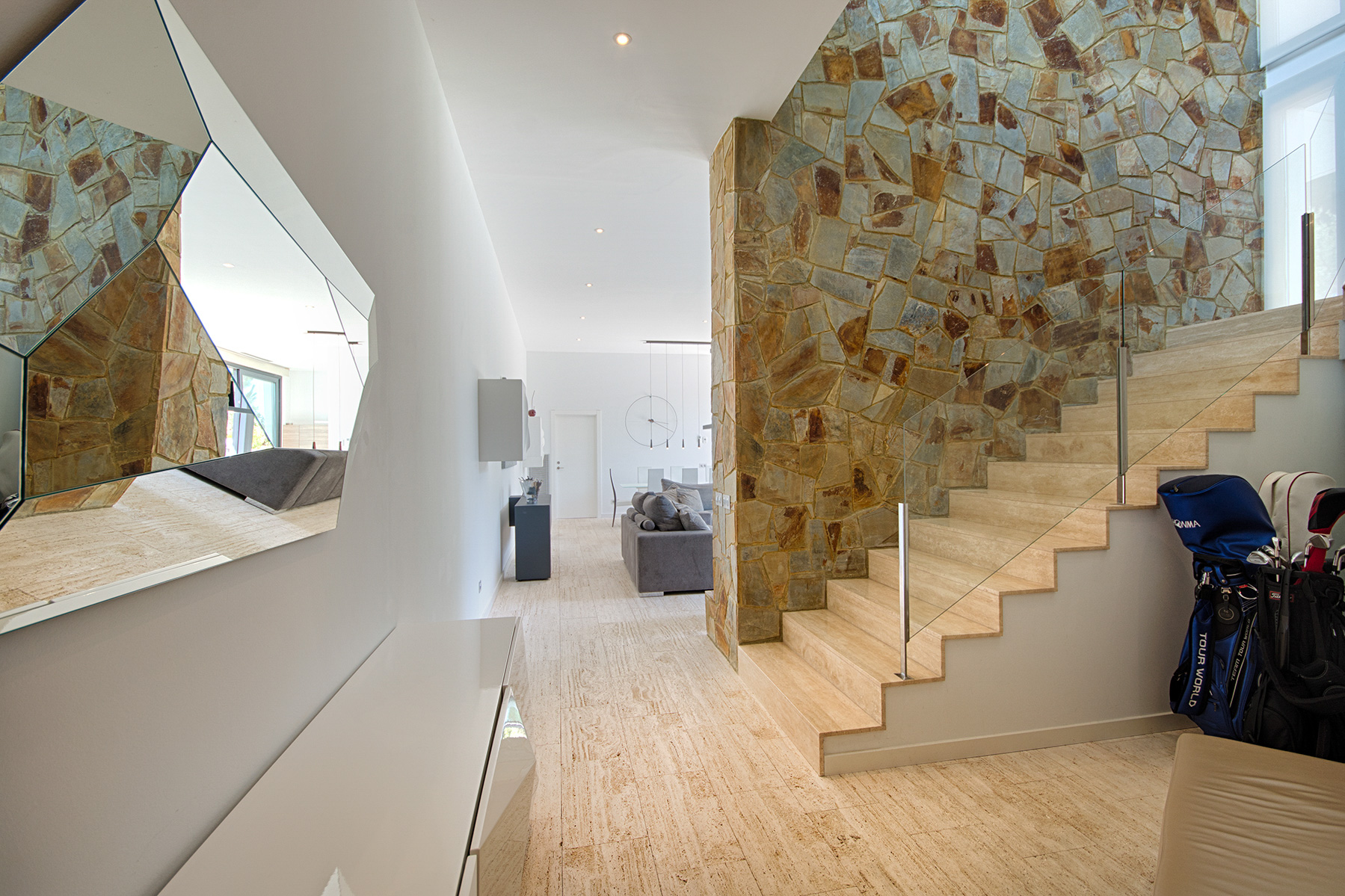 Modern and spacious, with a gym and lengthy pool that is suitable for laps, the property has been designed with wellbeing in mind. With mature greenery all around and a landscaped garden, the neutral façade and original stone walls blend in with the natural surroundings despite it being a contemporary property. Inside, the use of wood and stone brings elements of the outdoors inside which creates a relaxing ambiance.